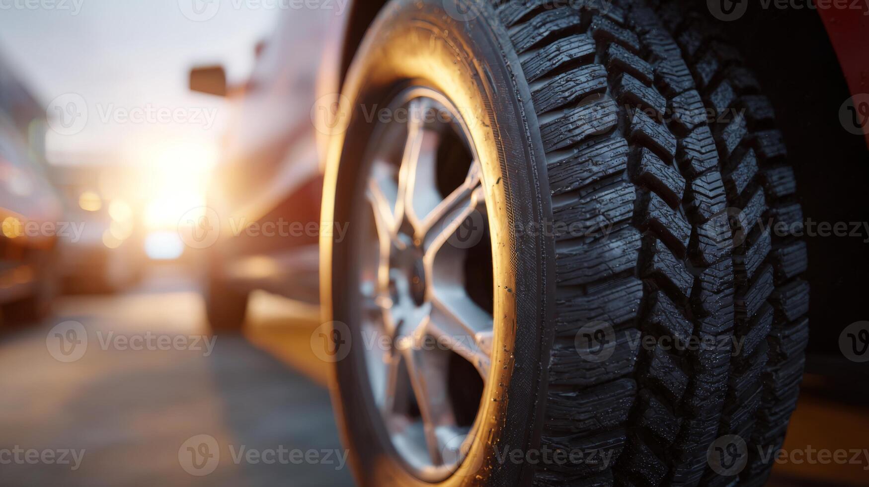 Close-up of a car tire showing detailed tread patterns at sunset, highlighting the durability and performance of the tire. Pro Photo