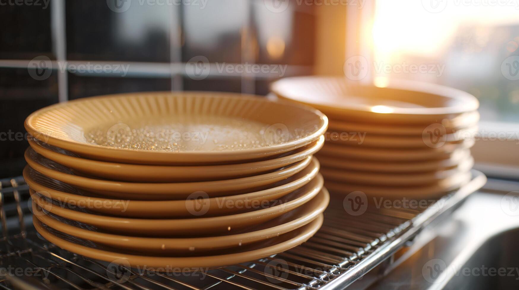 Warm morning light illuminates a stack of clean, tan plates, resting neatly in a drying rack by the window. Pro Photo