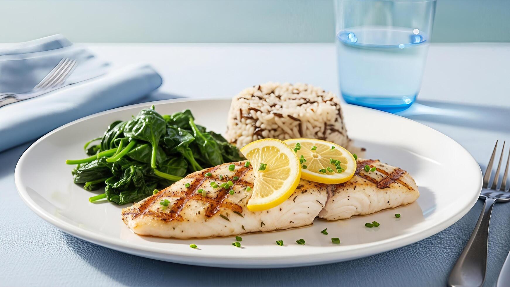 Elegant plating of grilled fish fillets adorned with lemon slices on a bright table photo