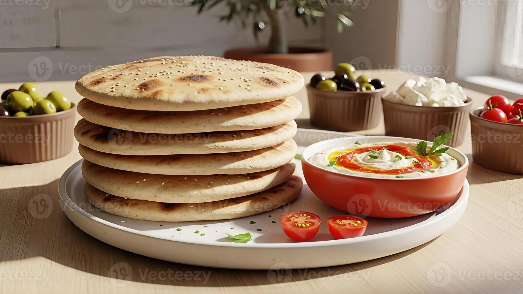 A stack of flatbread with hummus, vegetables and olives displayed on a table ready to be served Pro Photo