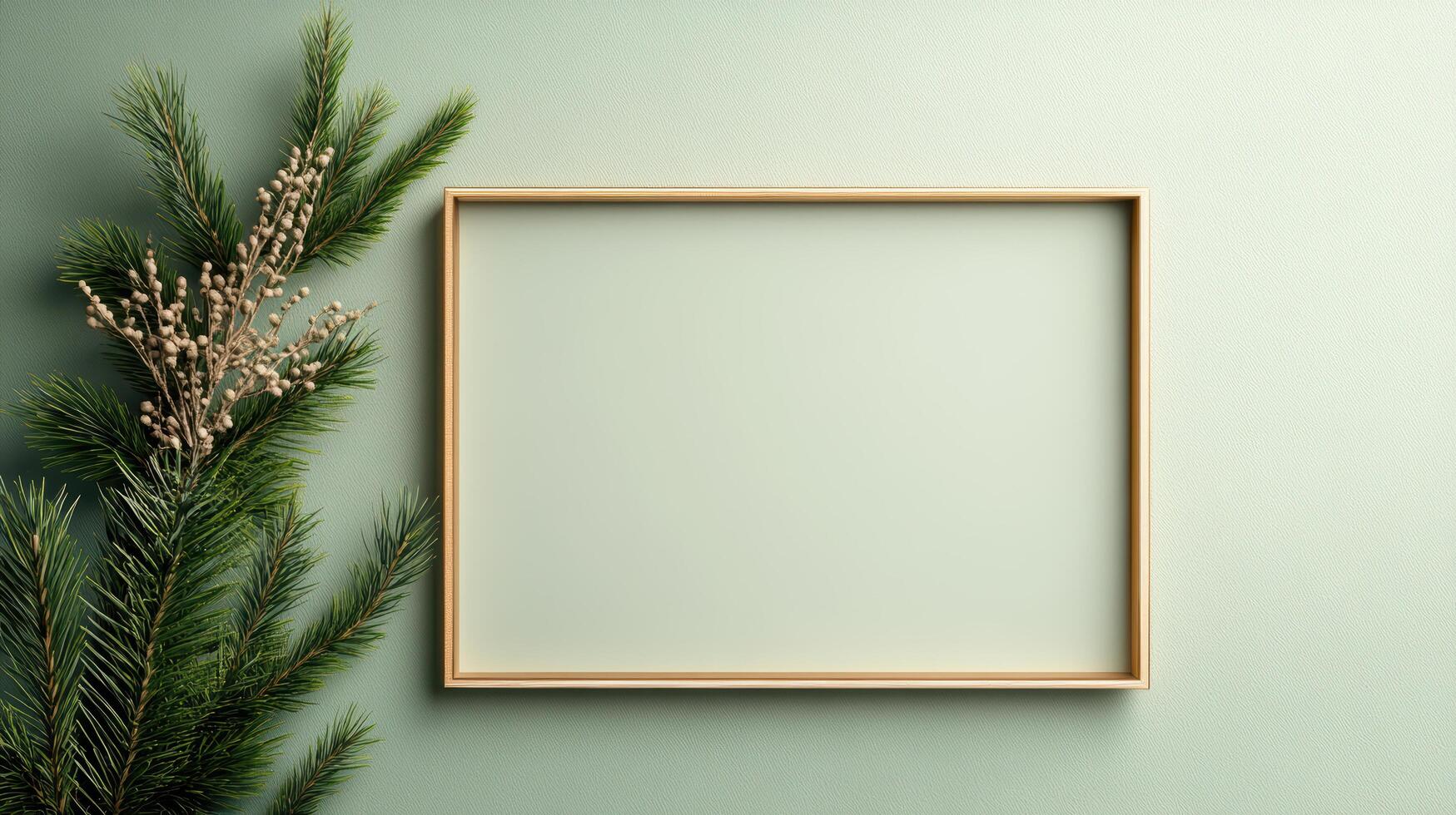 A blank frame on a green wall with a branch of fir tree photo