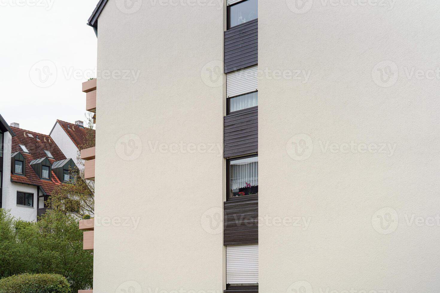 Modern building facade with windows and greenery in an urban setting during cloudy weather Pro Photo