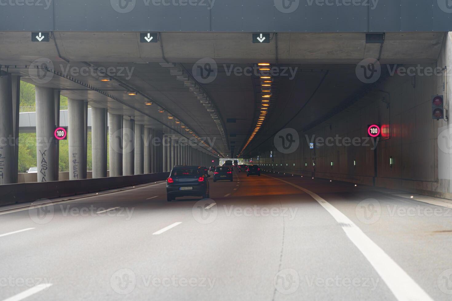 Traffic flows through an urban highway tunnel with clear speed limits on display during daylight hours in an organized infrastructure Pro Photo
