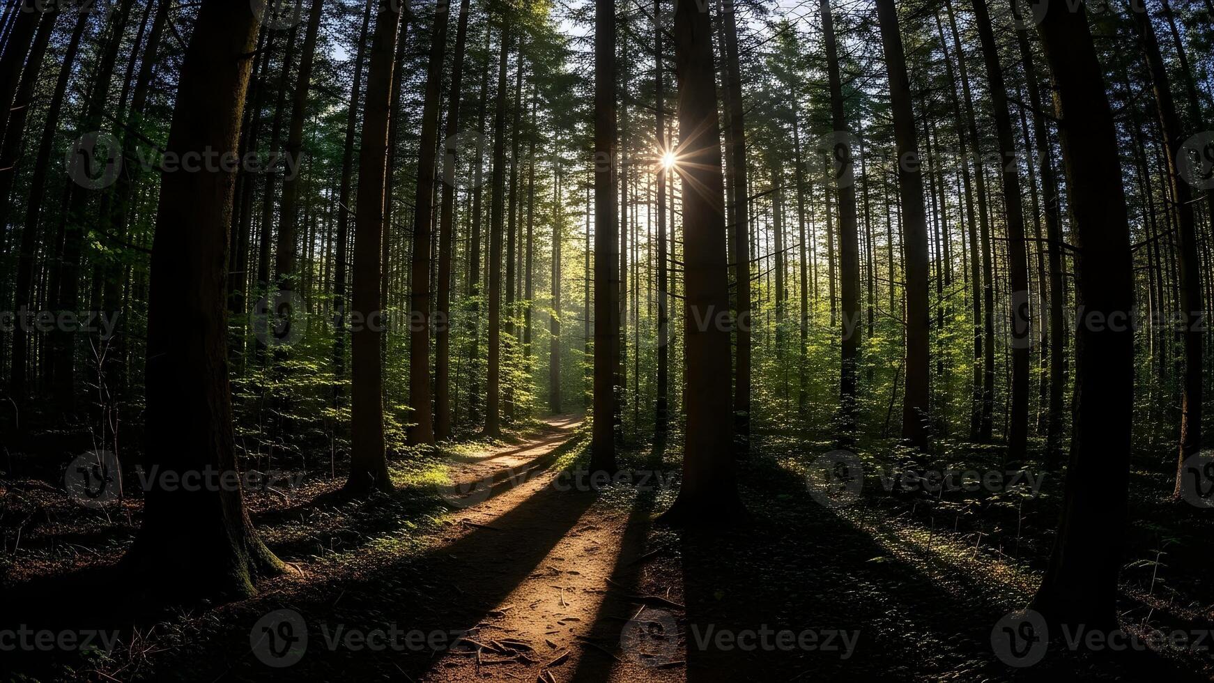 Sunlight streams through a forest of tall straight trees creating shadows. Pro Photo