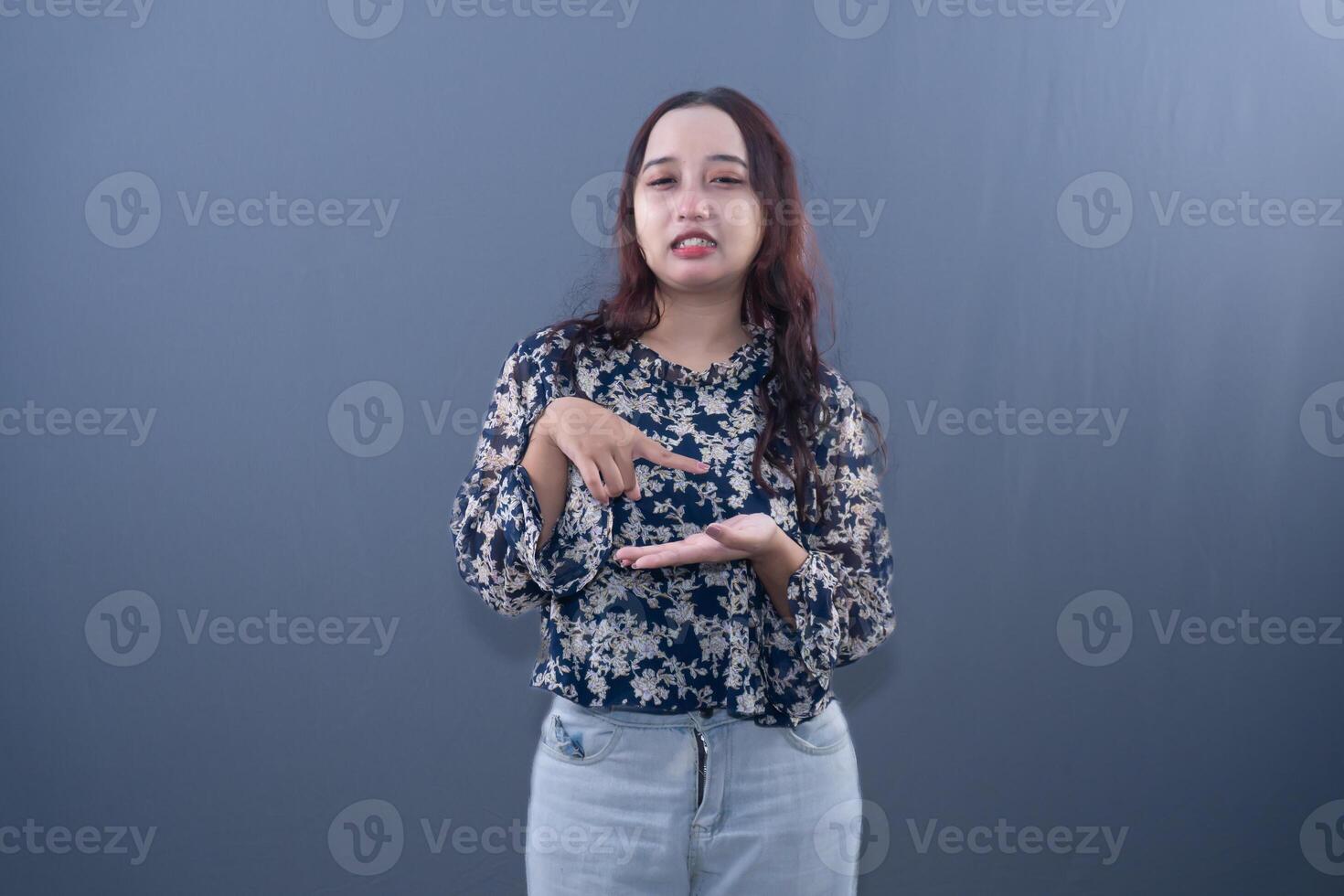 A woman with a slightly pained look is pointing to her left open palm with her right index finger Pro Photo