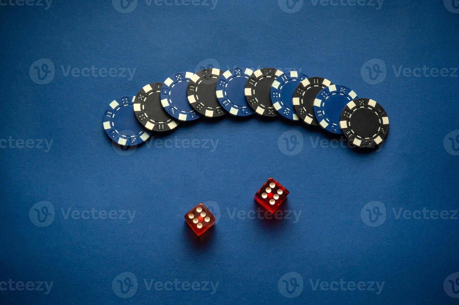 A collection of black and blue gaming chips is neatly arranged in a curve beside two red dice displaying the number two sixes. The setting is casual and ideal for game night Pro Photo