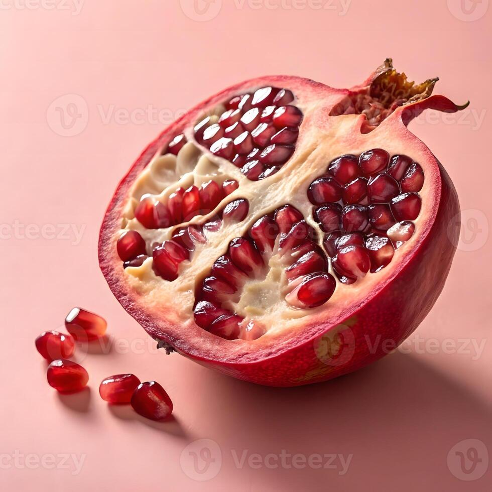 Hyper-detailed pomegranate slice centered on pastel red background with glowing ruby seeds and crisp macro structure in premium clarity. Pro Photo