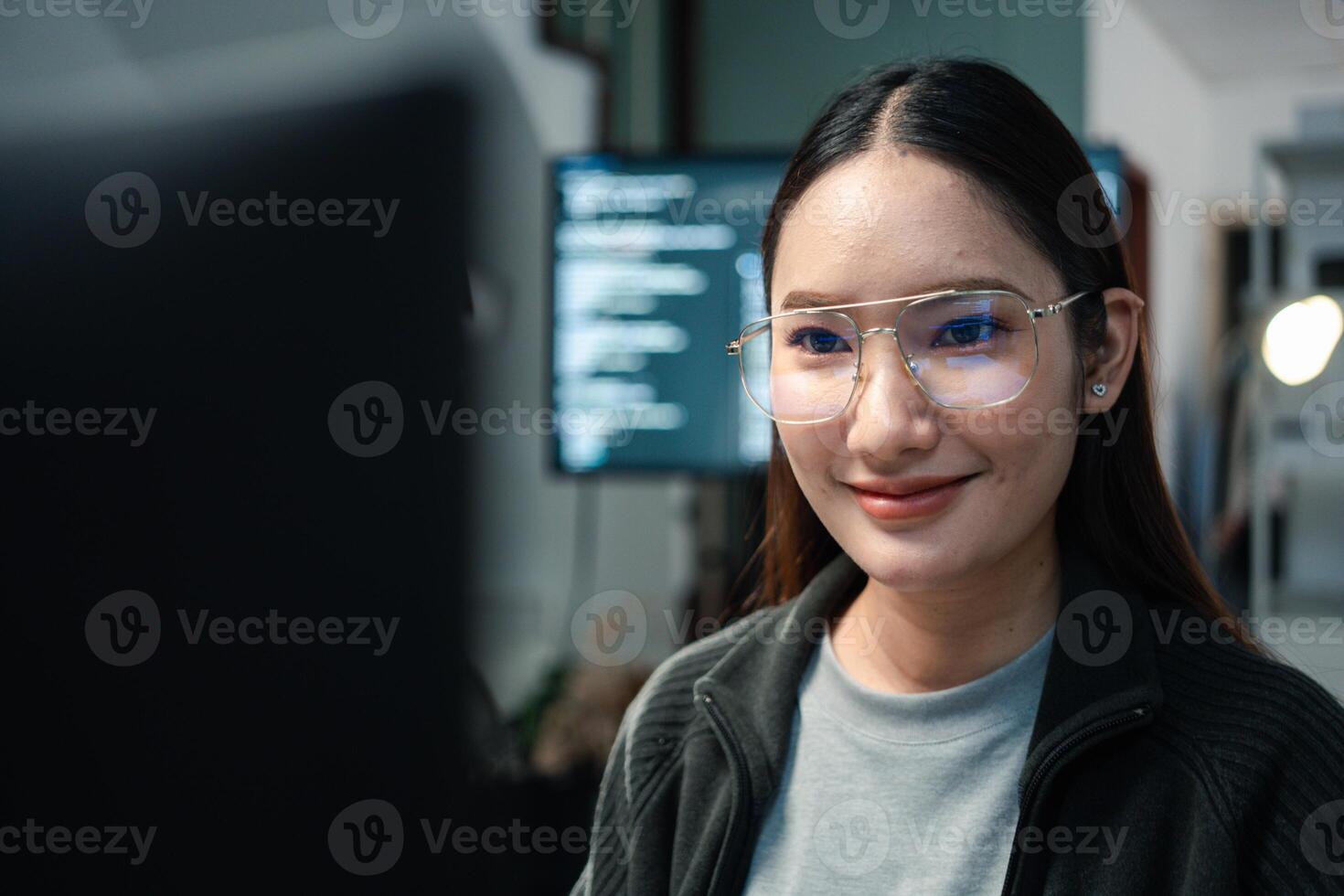 Asian woman confident programmer sitting in front of a computer with code in the background Pro Photo