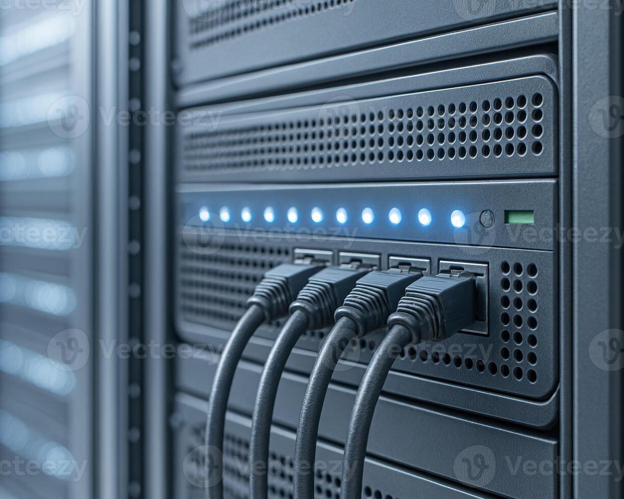 Close-Up of Network Server with Ethernet Cables and LED Indicators, Data Center and Digital Infrastructure Concept Pro Photo