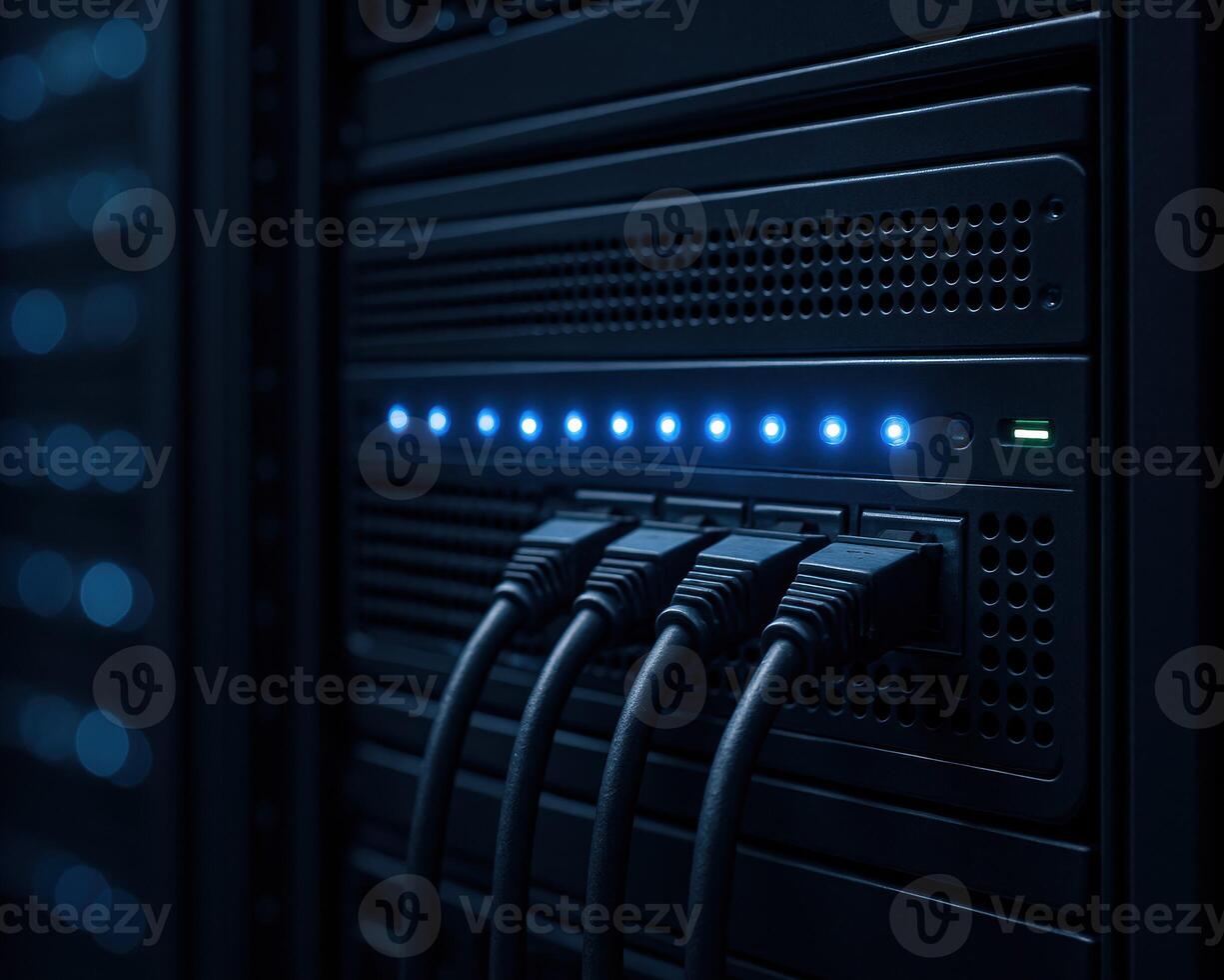 Close-Up of Data Server Connections with Cables and LED Lights in a Modern Data Center, Network Infrastructure Concept Pro Photo