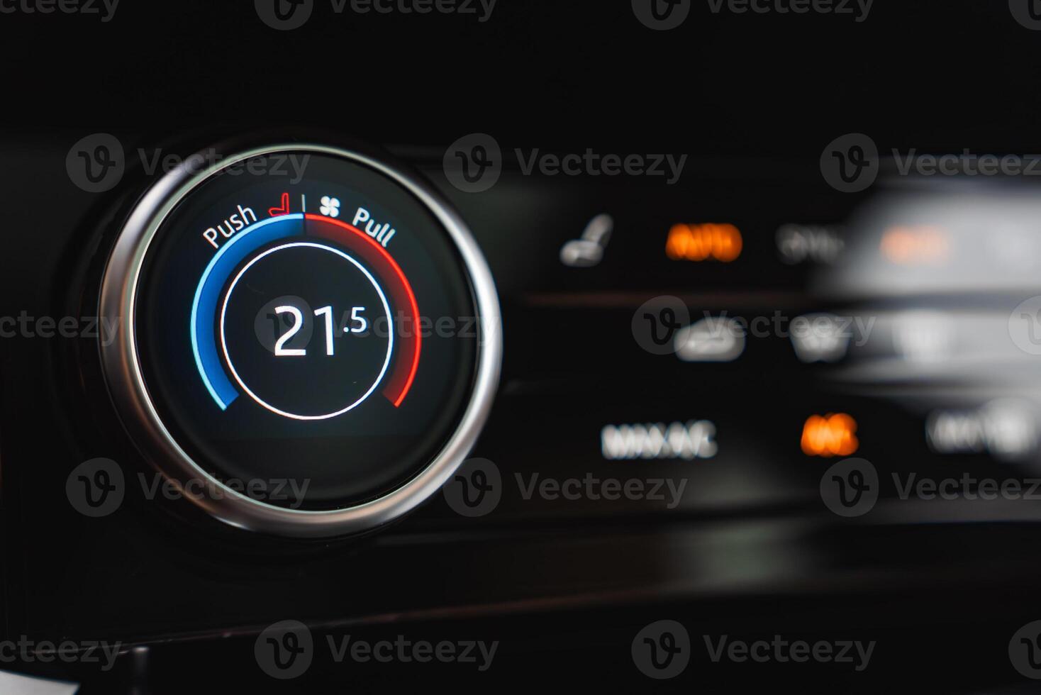 A close up shows a climate control dial at 21.5 C with blue and red arcs, seat and fan icons marked Push and Pull, and orange backlit AUTO and recirculation buttons in low light. Pro Photo