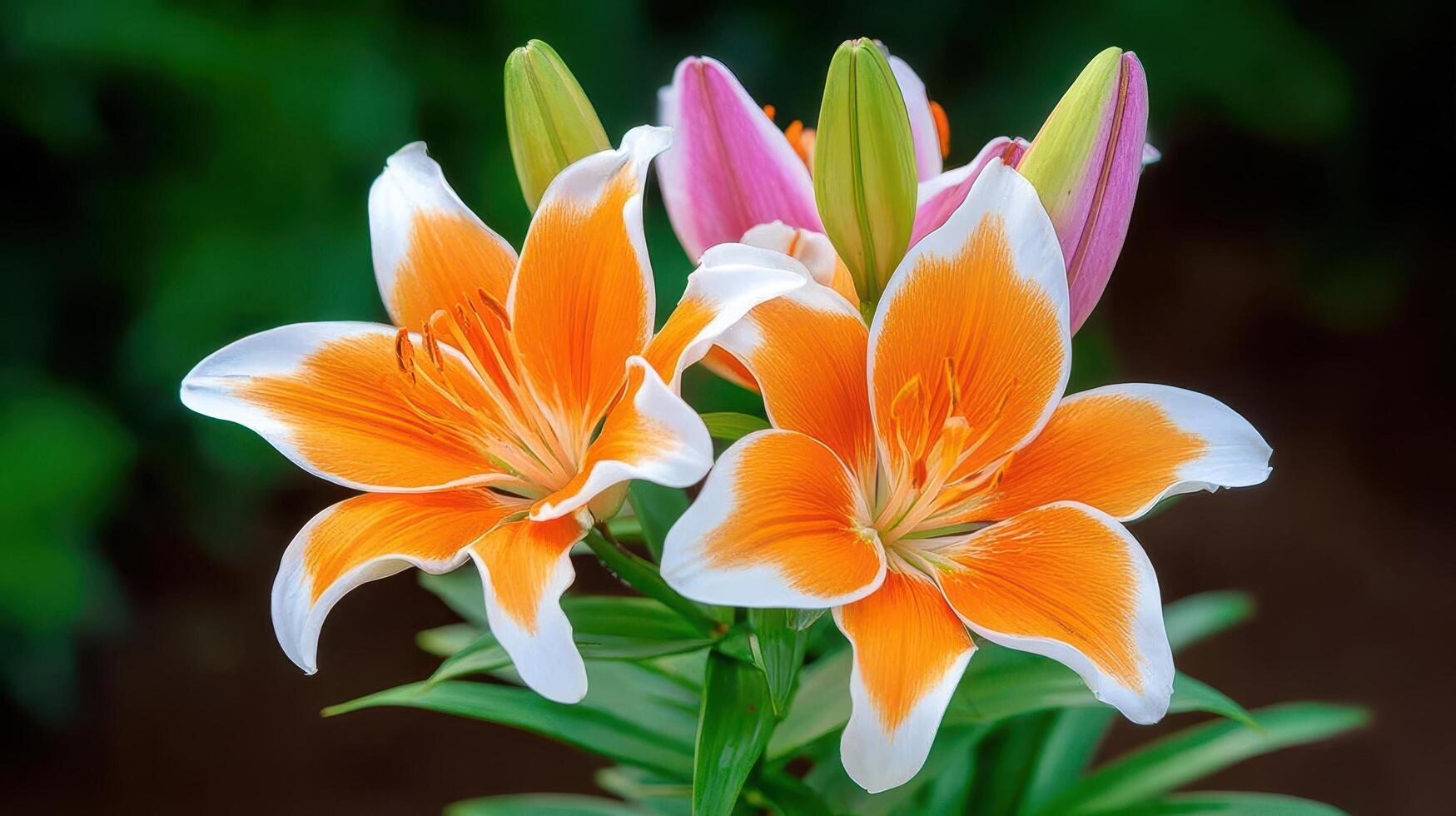 The lilies open slowly, revealing intricate patterns and soft, luminous tones gentle bloom. photo