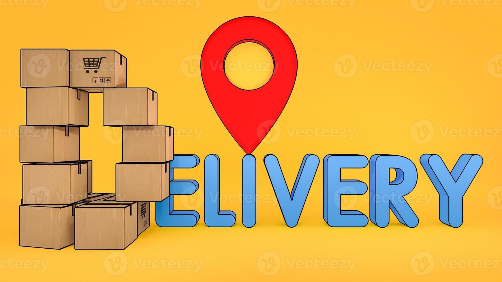 The paper box is arranged in a D shape with delivery font and red pin pointers., shopping online and delivery concept.,3D rendering. Pro Photo