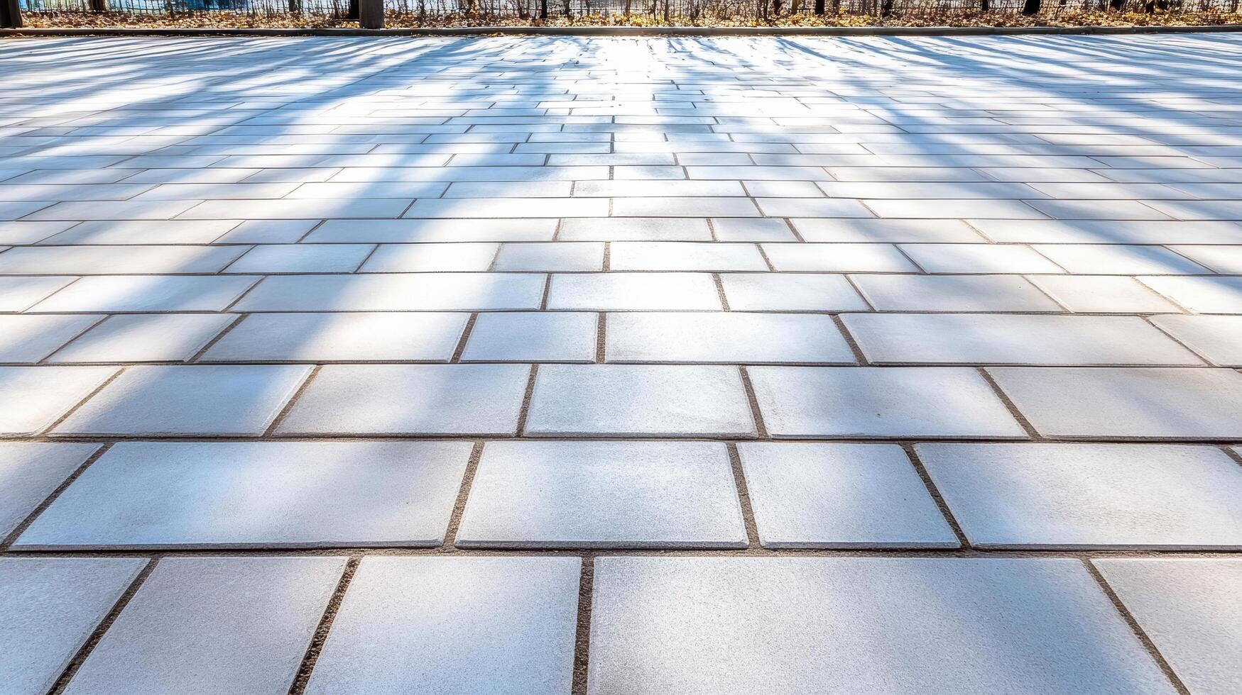 Sunlit paved walkway with long soft shadows creating calm geometric pattern photo