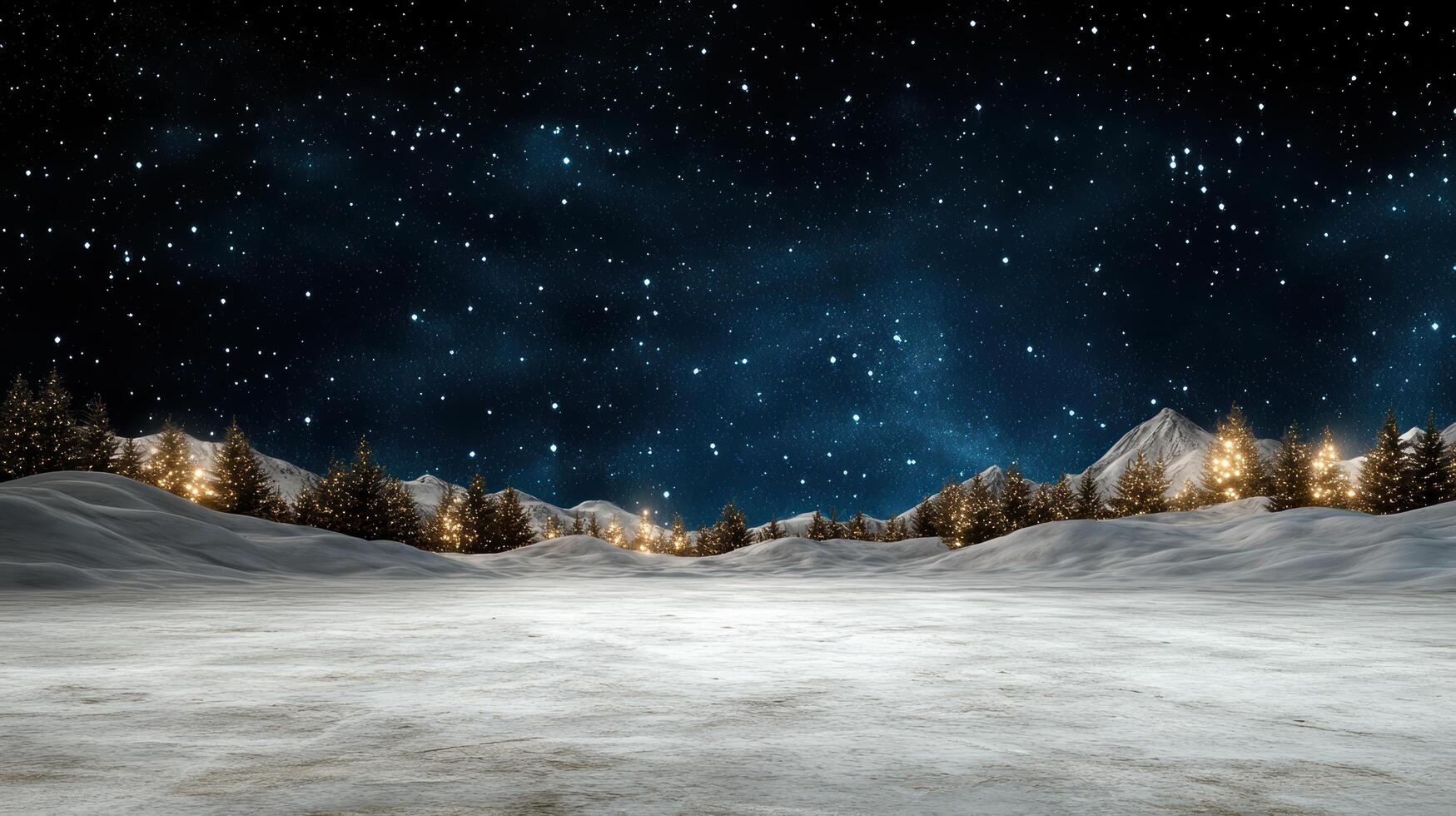 Snowy field under starry night with illuminated pine tree line creating serene winter glow photo
