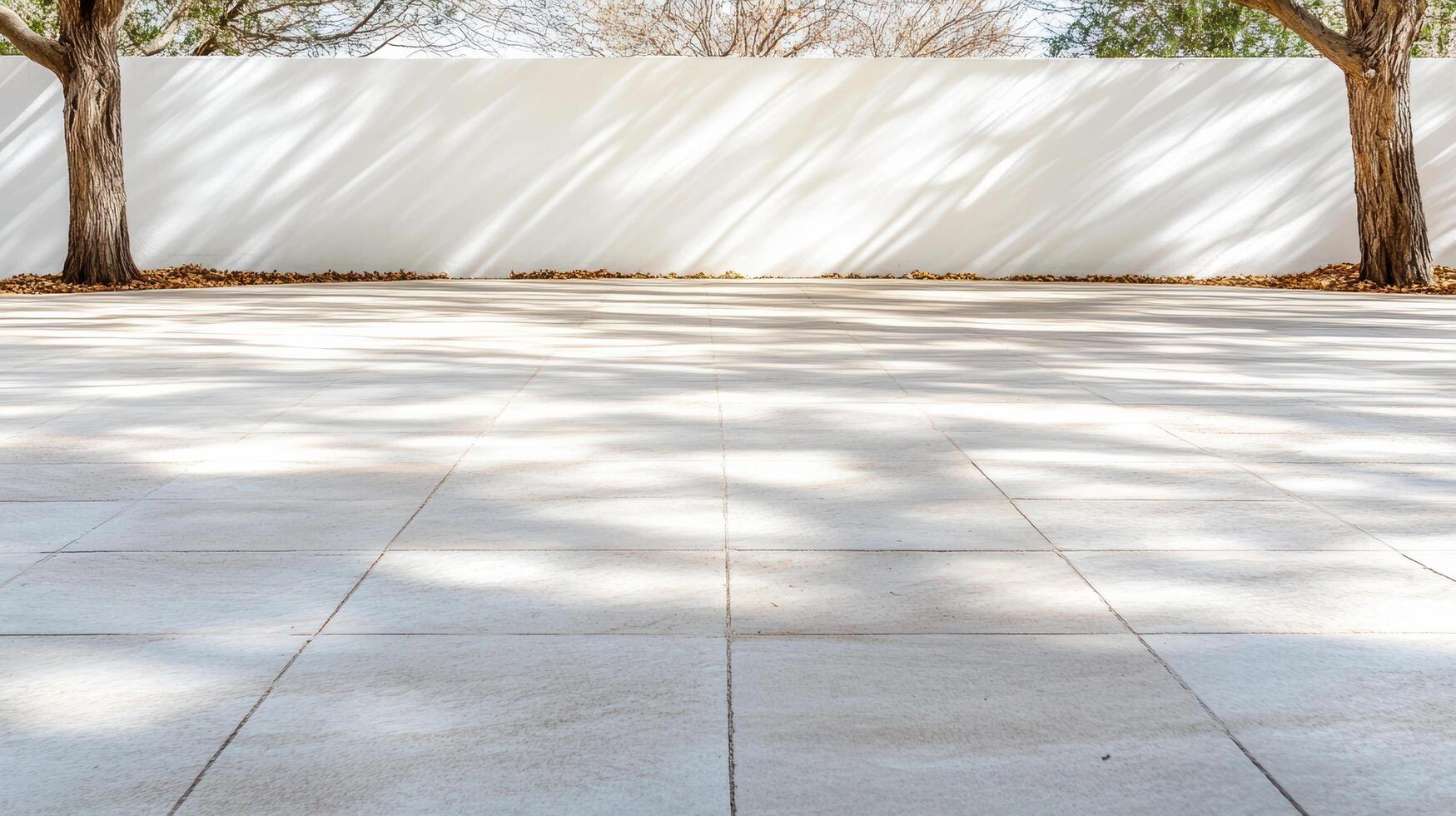 Long shadow pattern on tiled courtyard with white wall and tree trunks Free Photo