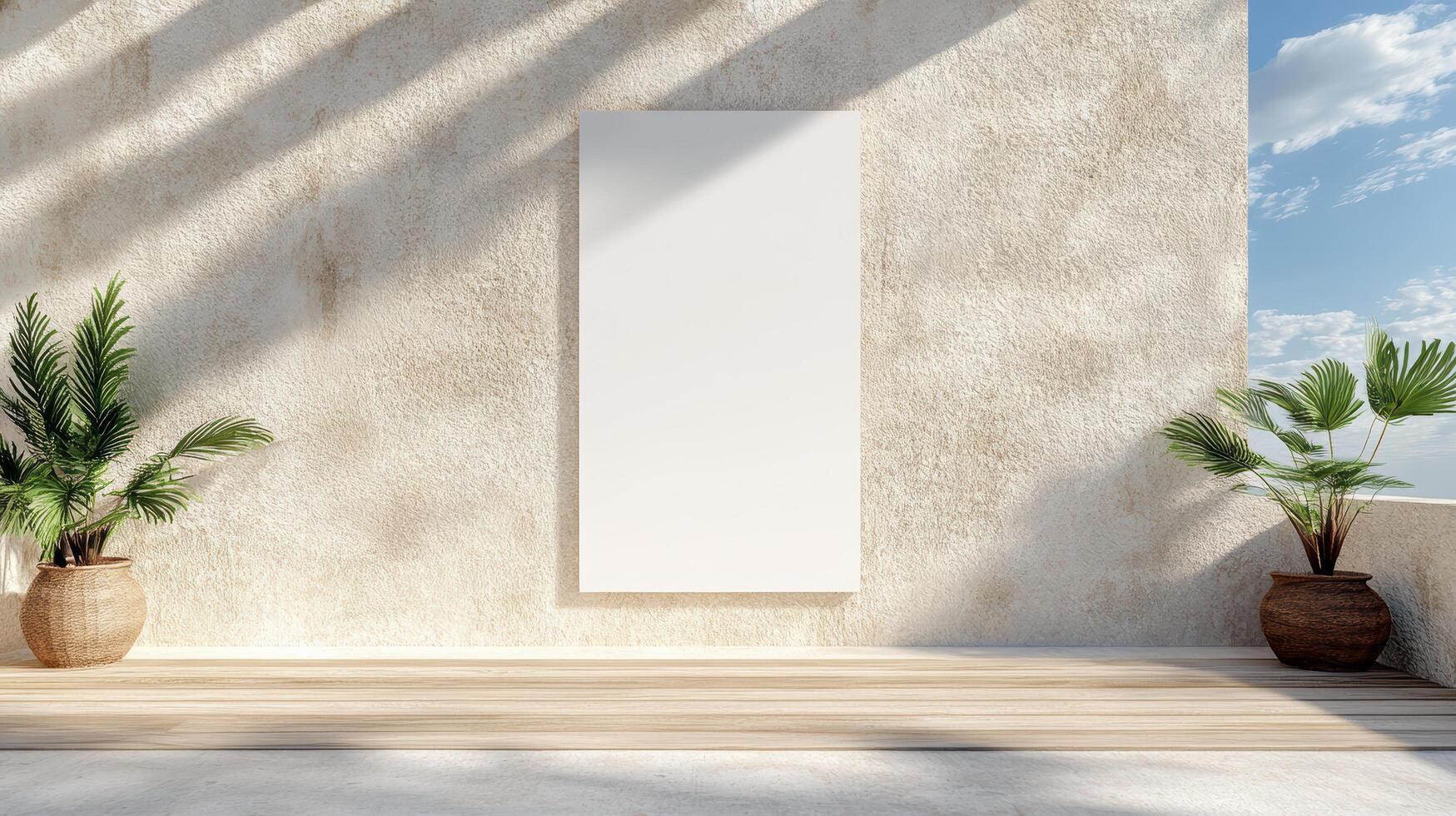 Blank vertical canvas textured wall with sunlit shadows and potted palms creating serene rooftop photo