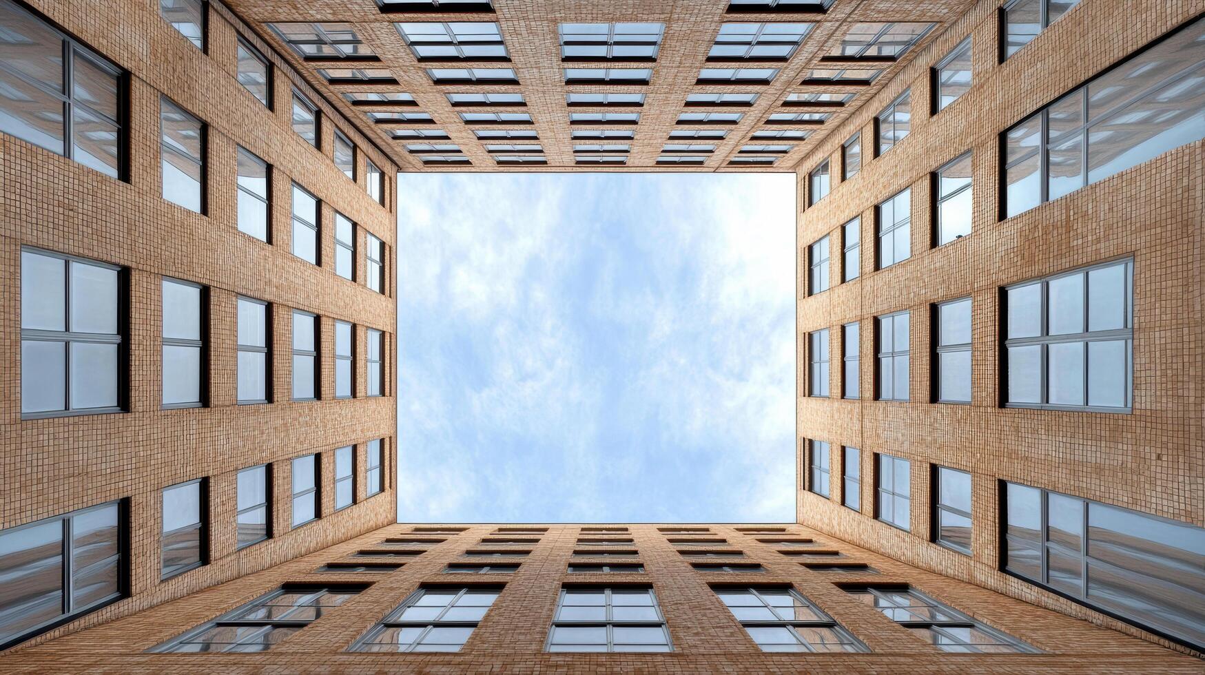 Open sky framed by tall brick building courtyard, symmetrical perspective with soft light Free Photo