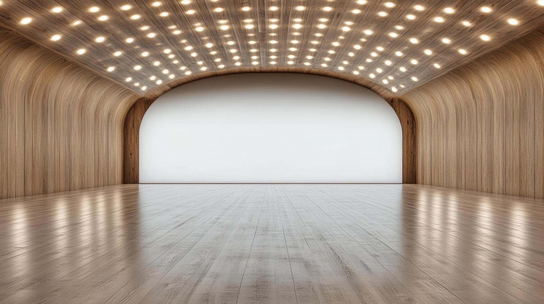 Spacious empty wooden hall with curved walls and illuminated ceiling creating calm ambiance Free Photo