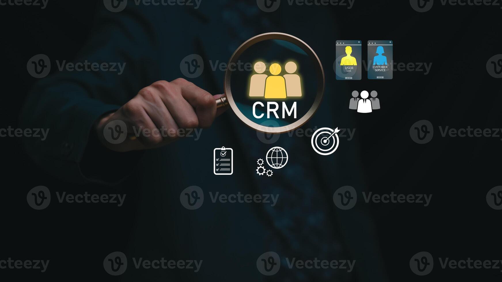 A business concept image showing CRM management with a magnifying glass highlighting customer data, analytics, and workflow icons, representing customer relationship strategy, digital tools Pro Photo