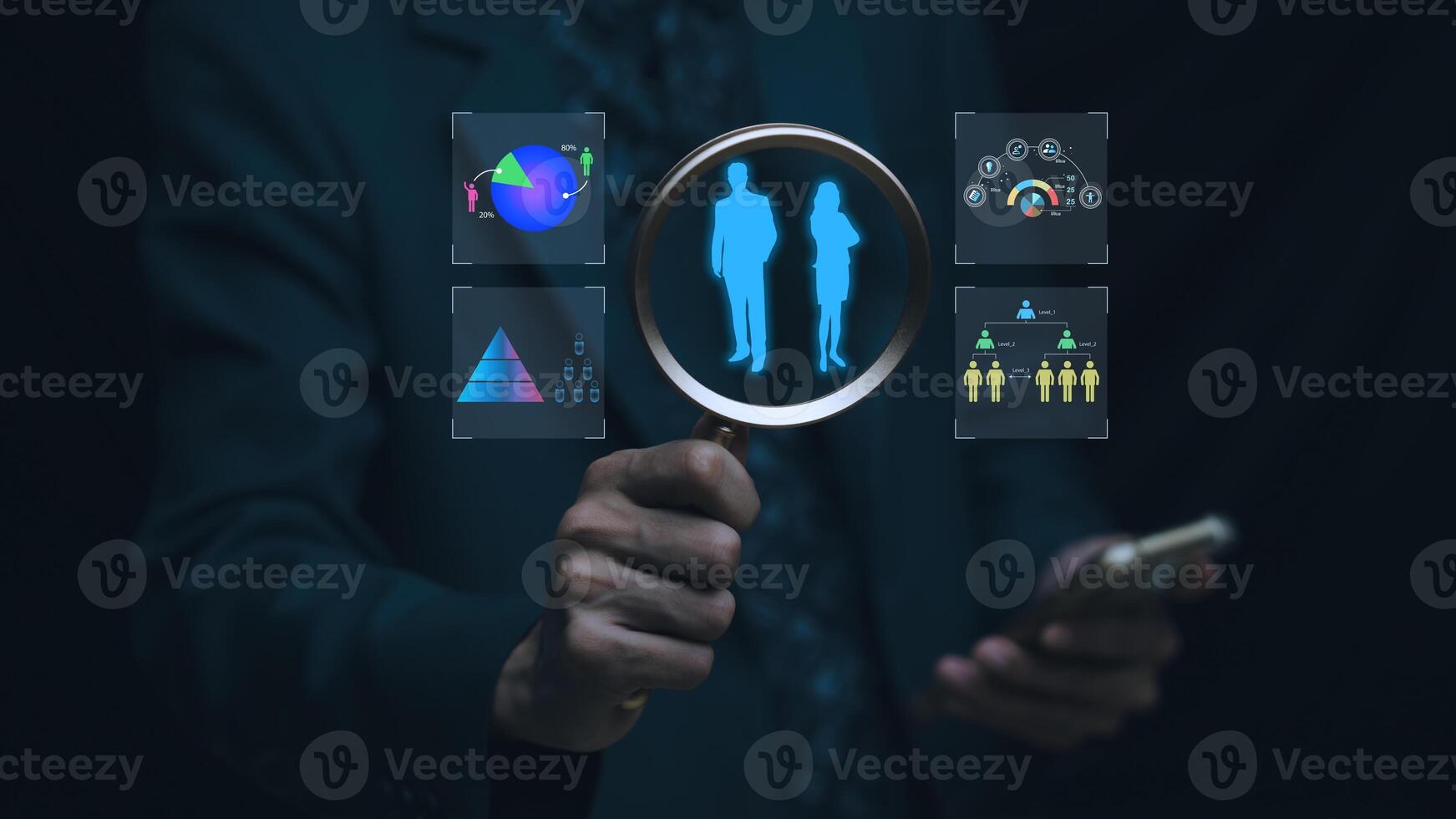 Digital demographic analysis concept showing hologram icons of population data, segmentation charts, and user structure above a man hand, representing data analytics, audience insights, and modern Pro Photo