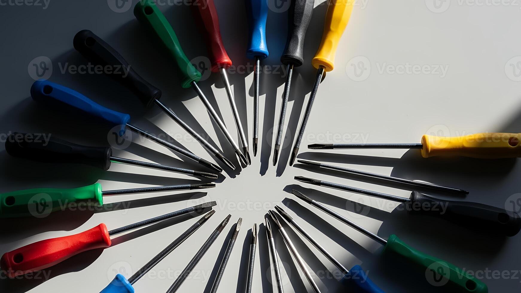 Colorful Screwdrivers Arranged in a Circular Pattern with Dramatic Shadows Pro Photo