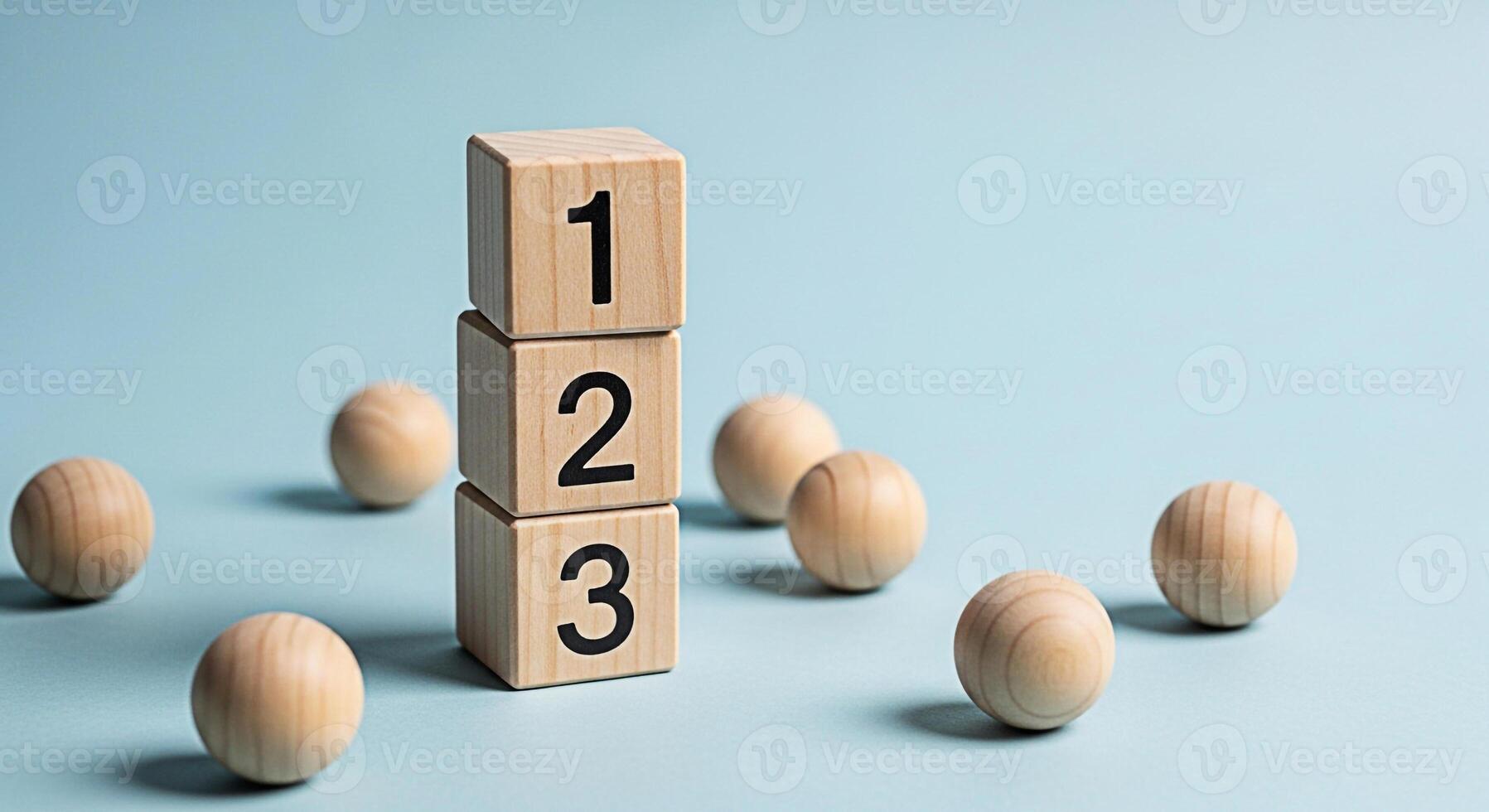 Stacked wooden blocks displaying numbers 1 2 3 surrounded by smooth wooden balls on a clean light blue background representing sequential steps priority and organized processes Pro Photo