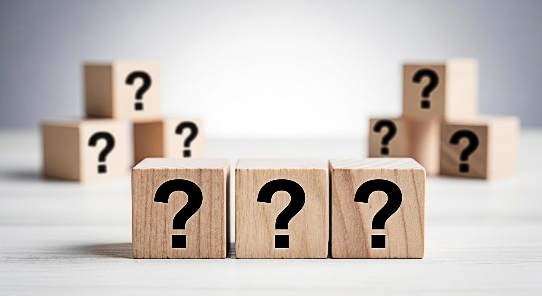 Wooden blocks displaying question marks on a white surface representing uncertainty and the need for answers in a bright minimalist setting symbolizing problemsolving and decisionmaking photo