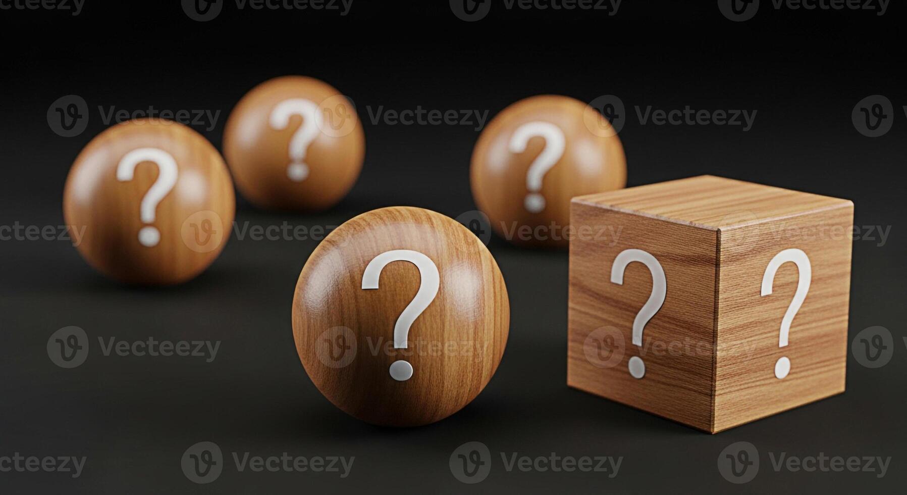 Wooden spheres and cube displaying question marks on a dark surface representing uncertainty mystery and the unknown evoking curiosity and a sense of inquiry in a minimalist setting Pro Photo