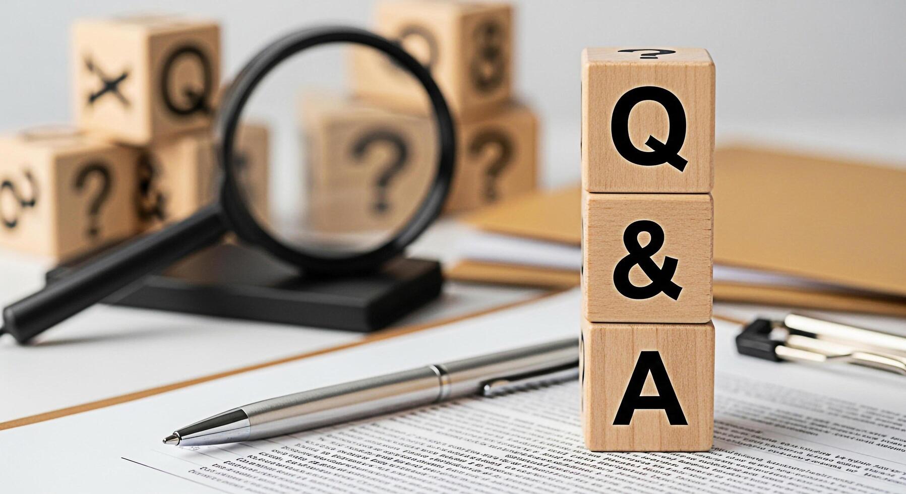 Wooden blocks displaying QA on a white desk with a magnifying glass and pen representing problemsolving and information seeking in a professional and educational environment conveying clarity and unde photo