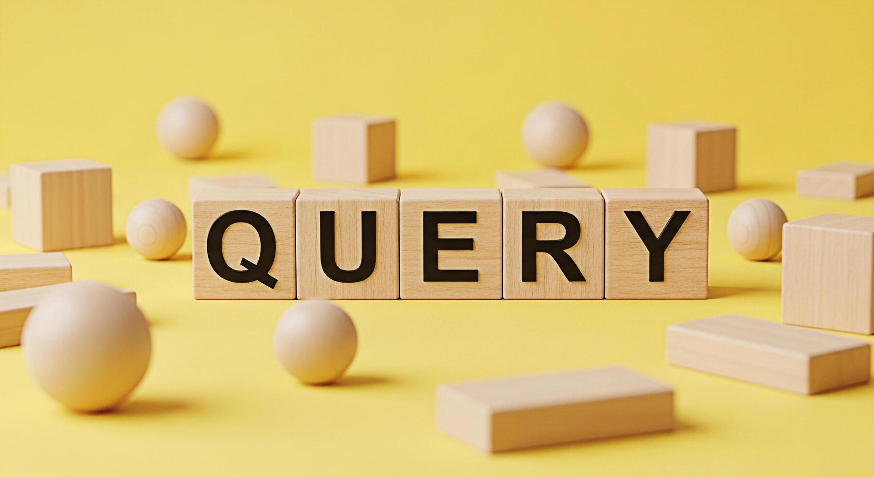 Wooden blocks spelling QUERY on a bright yellow surface surrounded by wooden shapes representing information retrieval and search engine optimization in a playful and engaging manner Free Photo