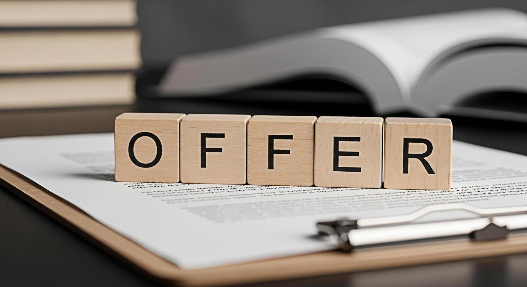Wooden blocks spelling OFFER resting on a contract document in a professional office setting symbolizing a business proposal and creating a sense of opportunity and potential agreement photo