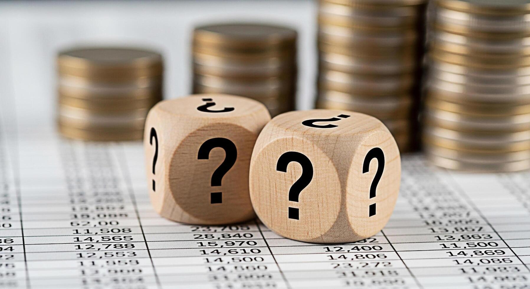 Wooden dice displaying question marks resting on a financial report with stacks of coins in the background representing financial uncertainty and investment decisions in a complex market environment photo