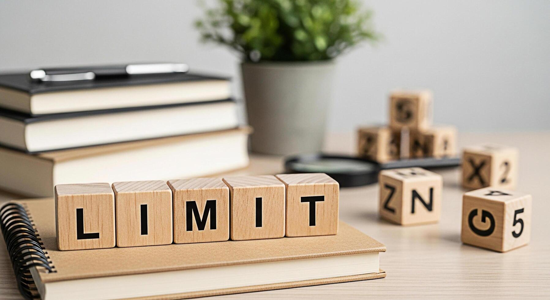 Wooden blocks spelling LIMIT sitting on a notebook in a bright office representing boundaries and restrictions promoting focus and productivity in a work environment with books and a plant photo