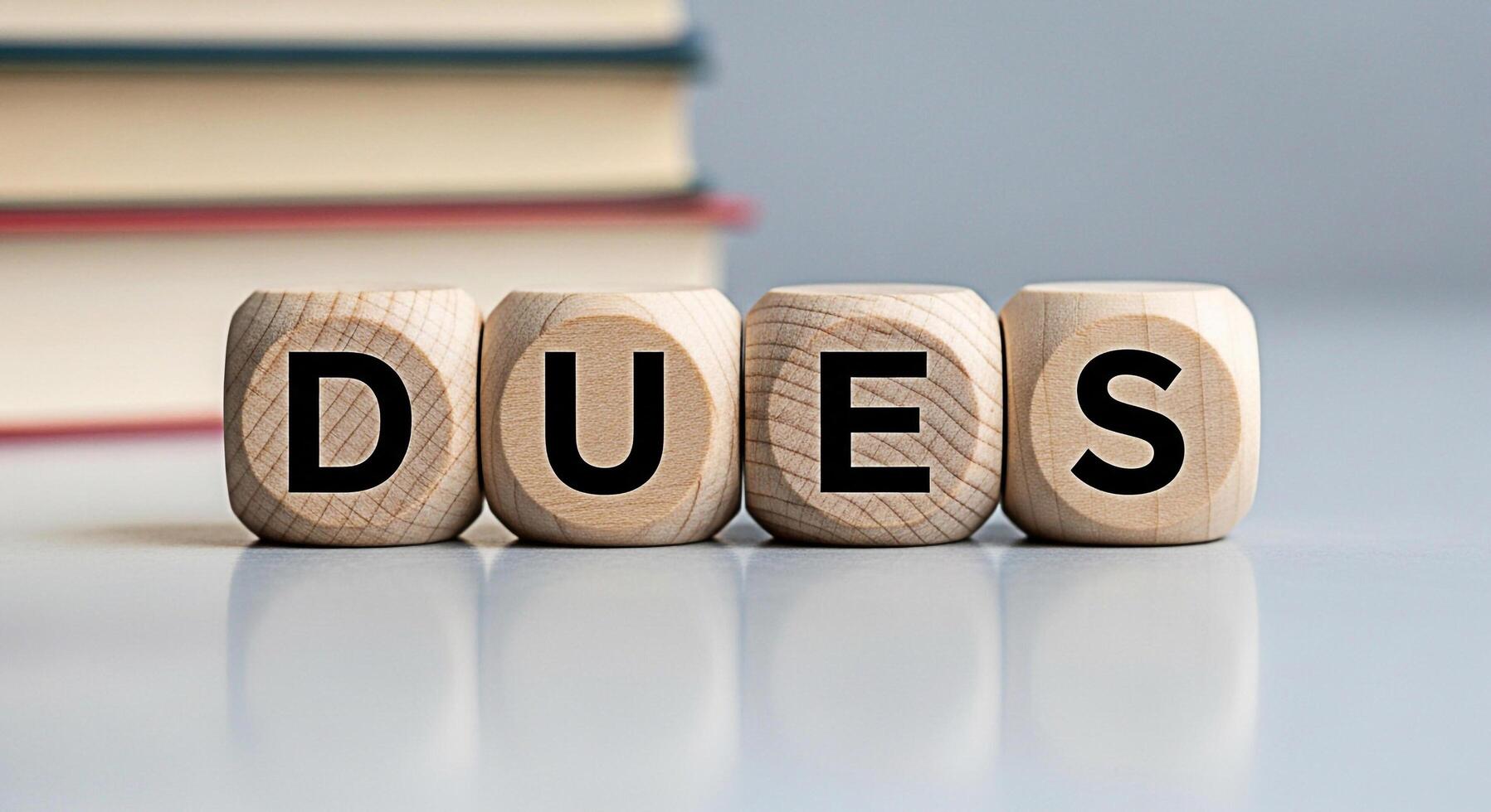Wooden blocks spelling DUES on a table with books in the background representing financial obligations and responsibilities in an educational or professional setting conveying a sense of commitment photo