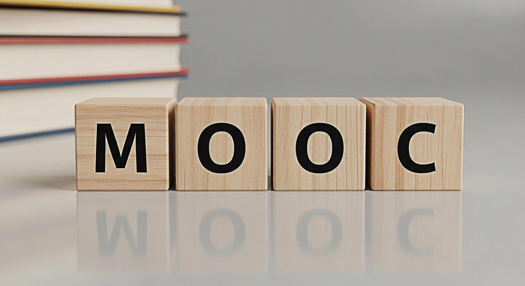 Wooden blocks displaying MOOC concept on a reflective surface with books in the background representing massive open online courses and accessible education for lifelong learning and skill development photo