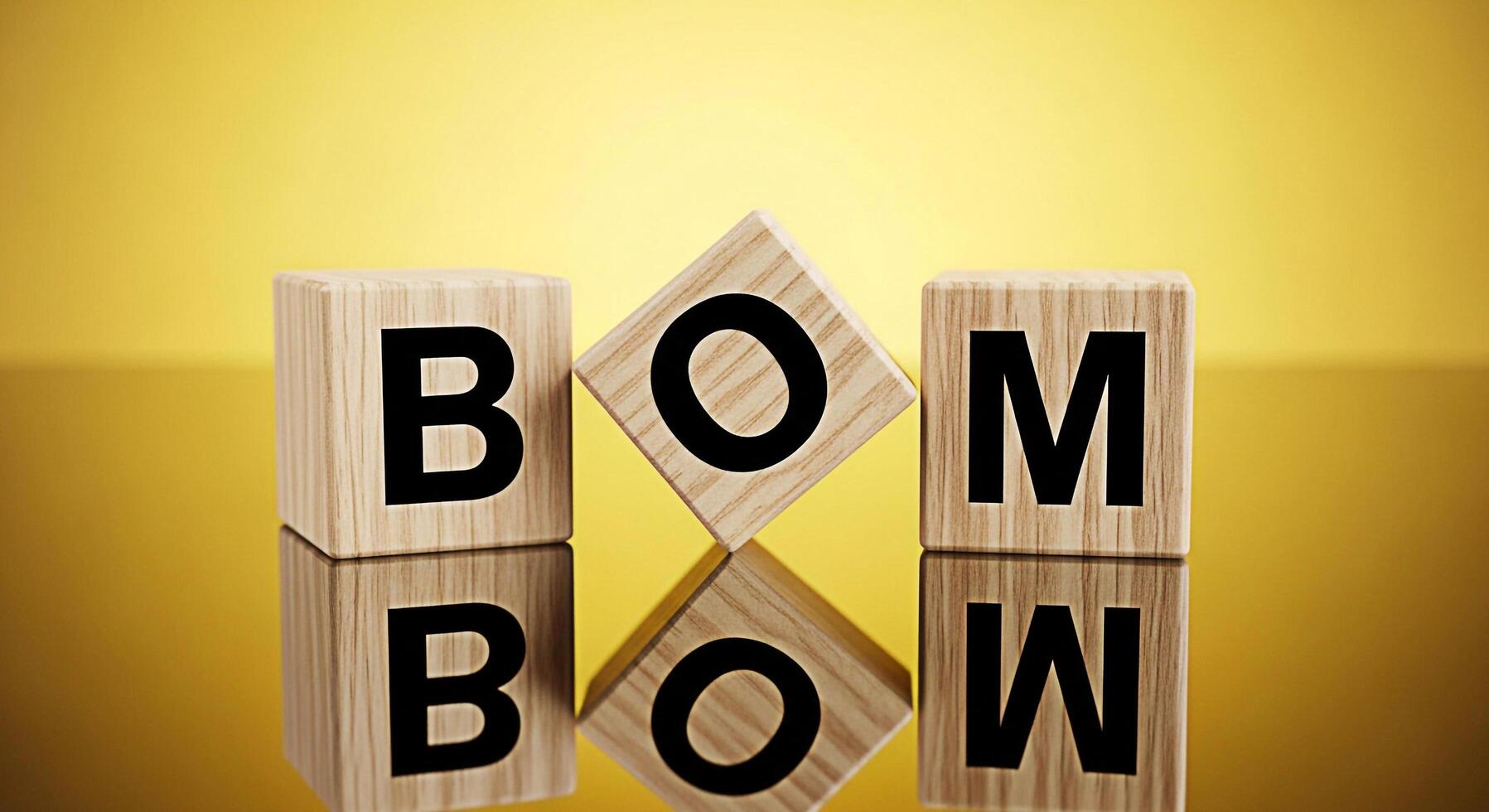 Wooden blocks spelling BOM on a reflective surface against a golden background symbolizing a creative and playful approach to language and wordplay perfect for educational or designrelated projects photo