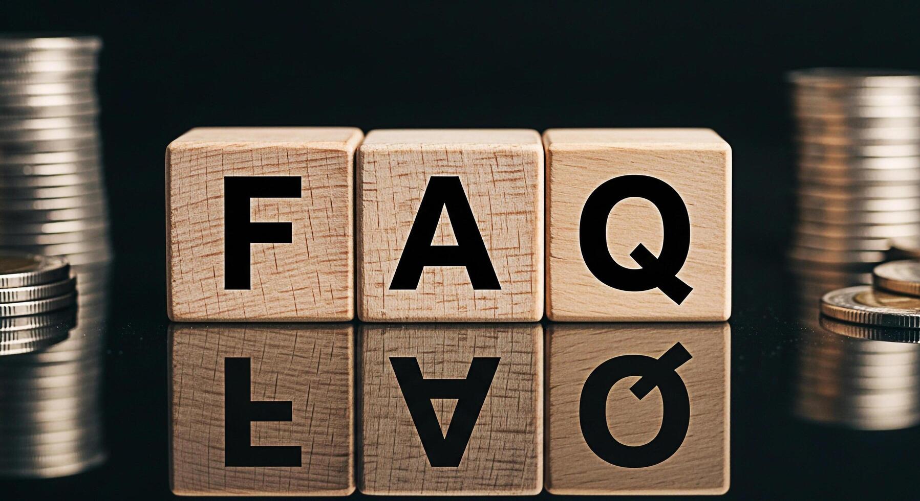 Wooden blocks spelling FAQ with stacked coins on a reflective surface representing financial questions and answers creating a sense of clarity and guidance in financial matters photo