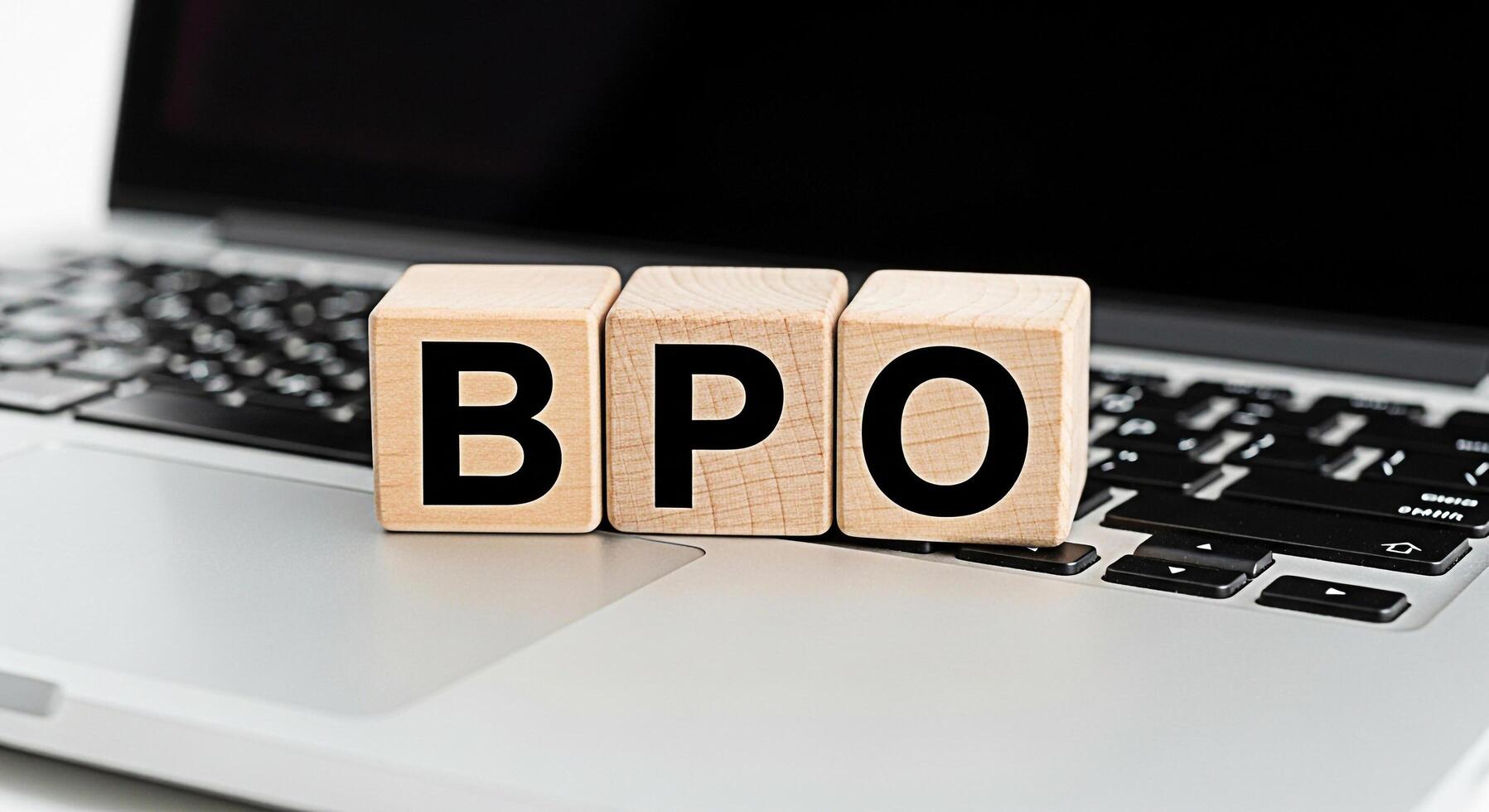Wooden blocks spelling BPO resting on a laptop keyboard in a bright office setting symbolizing business process outsourcing and efficient workflow solutions for modern companies photo