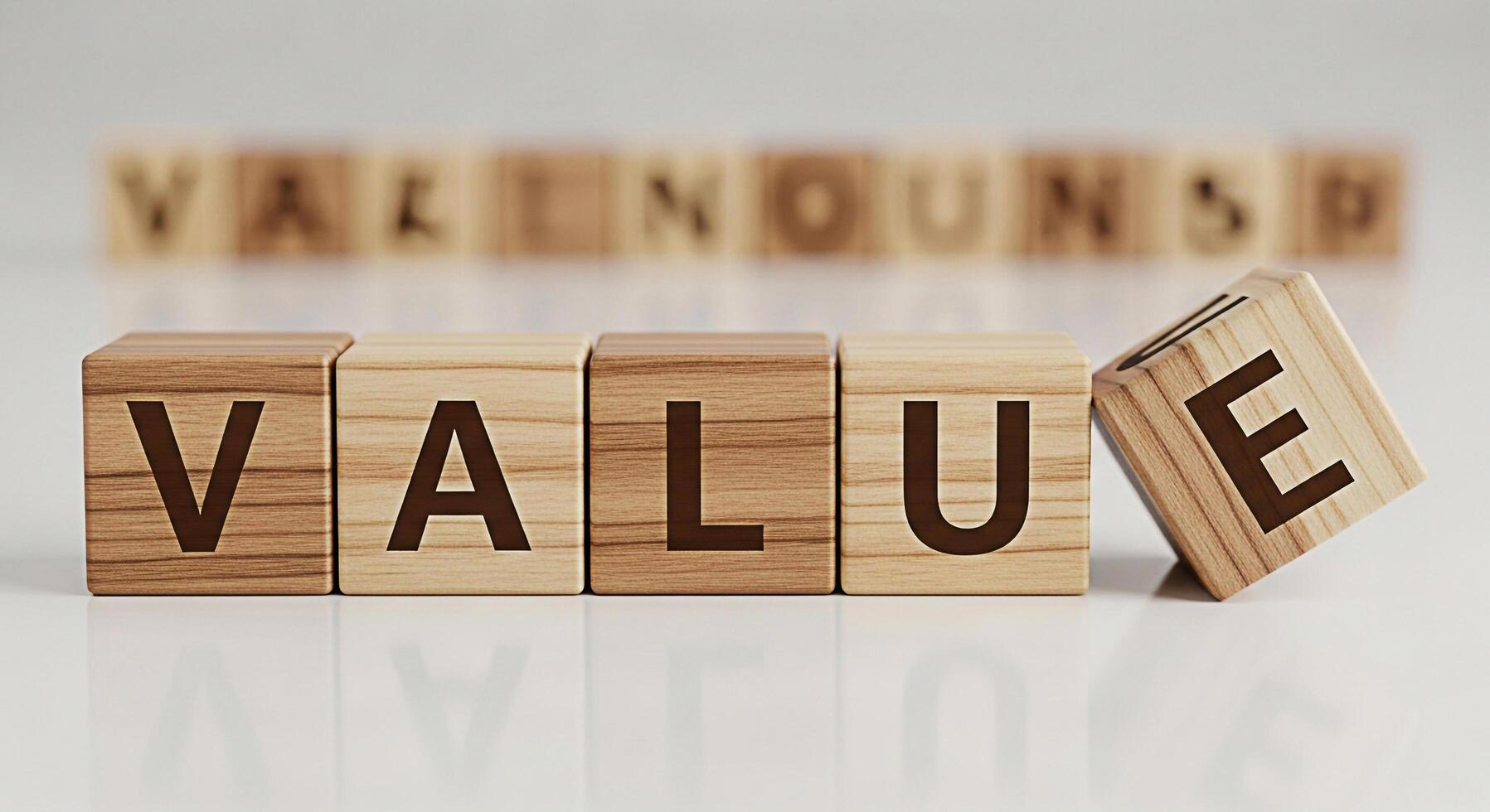 Wooden blocks spelling VALUE on a white surface with one block slightly tilted symbolizing importance and emphasis on core values in business and personal life conveying a message of integrity and wor photo