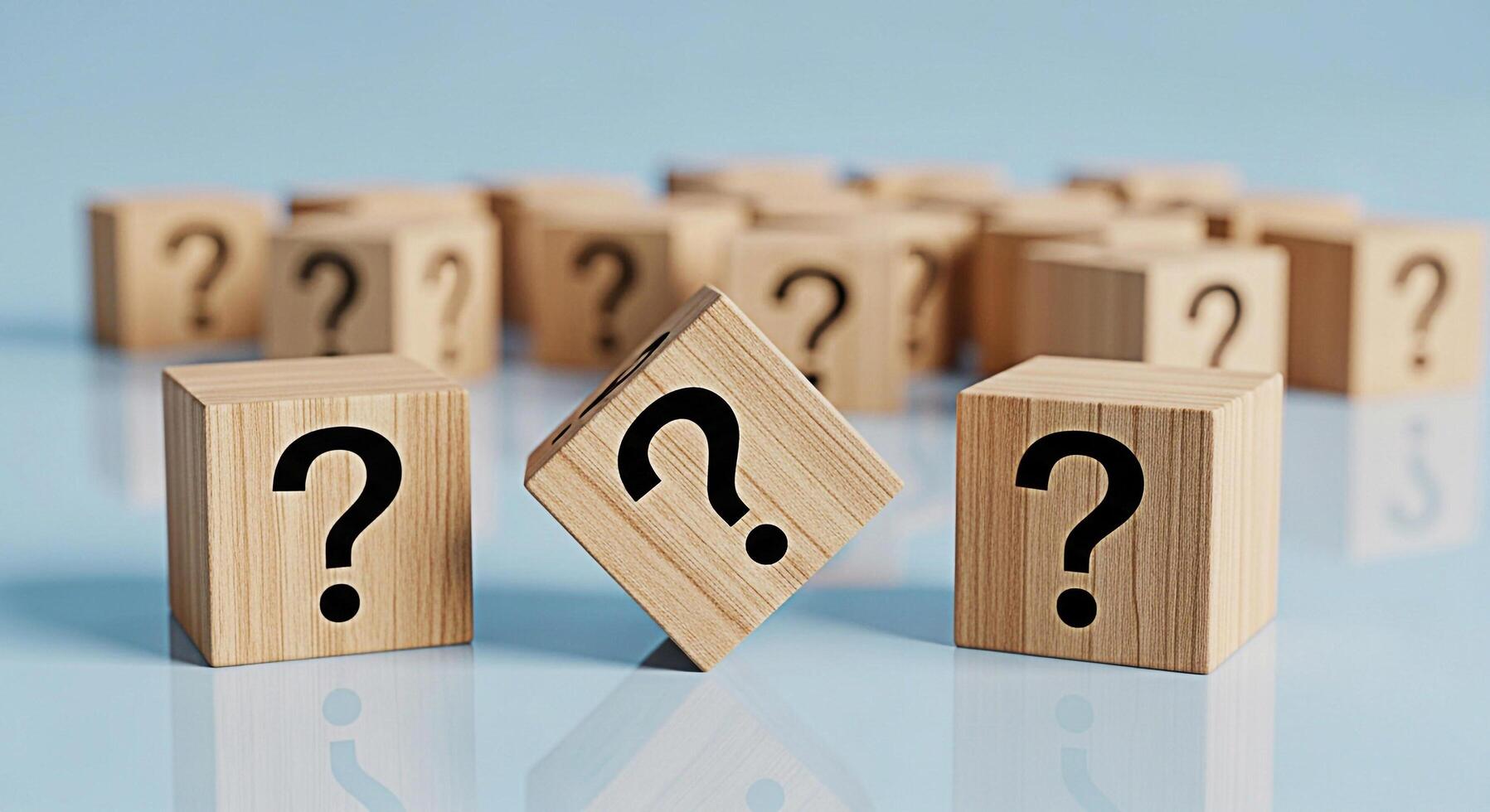 Wooden cubes displaying question marks on a reflective surface symbolizing uncertainty and the need for answers in a complex and ambiguous situation creating a sense of curiosity and inquiry photo