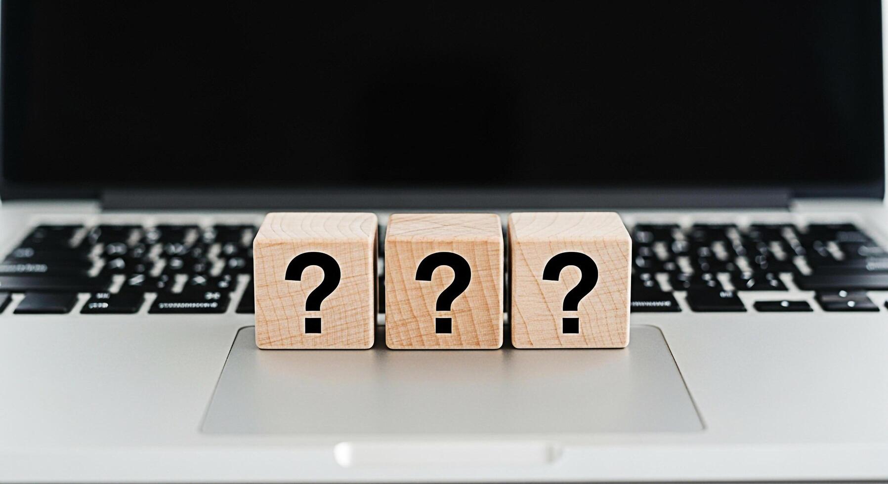 Three wooden blocks displaying question marks resting on a laptop keyboard in a bright office symbolizing uncertainty problemsolving and the need for answers in the digital age photo