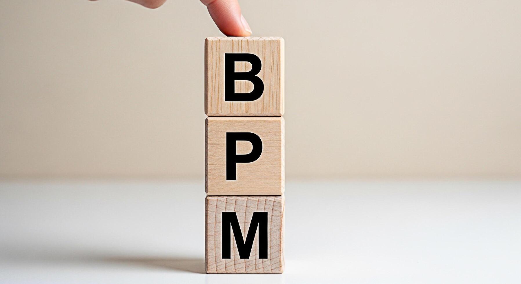 Conceptual shot of a finger touching wooden blocks spelling BPM in a bright studio representing business process management and workflow optimization for improved efficiency and strategic planning Free Photo