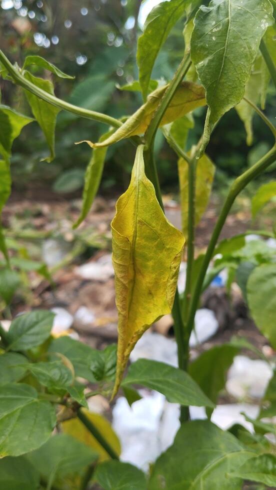 Yellowing chili leaves with damaged edges provide a powerful visual example for a plant problem detection machine learning dataset. photo