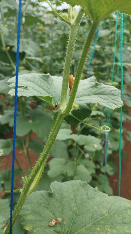 The hydroponic melon stem is clearly visible from an eye-level angle, showing the fiber structure and fine thorns, used as visual data for AI training to detect plant stem conditions. photo
