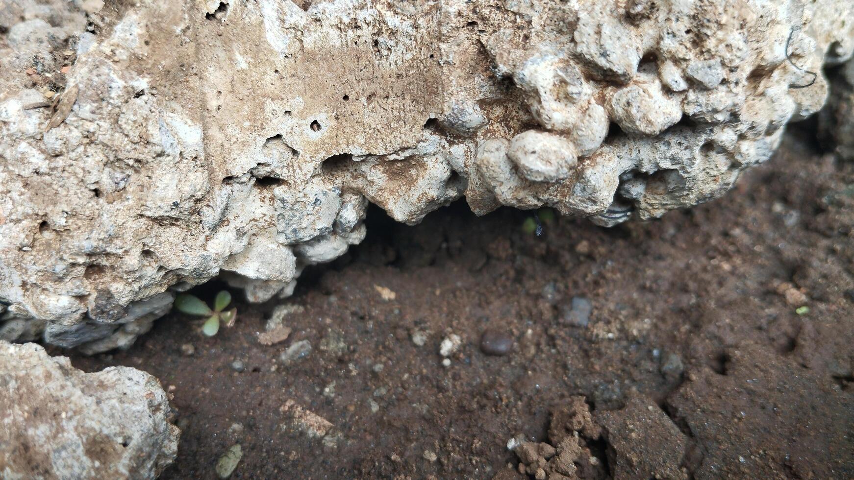 Close-up photo of a damaged concrete surface with an irregular pattern, in natural lighting. Relevant for visual AI learning.