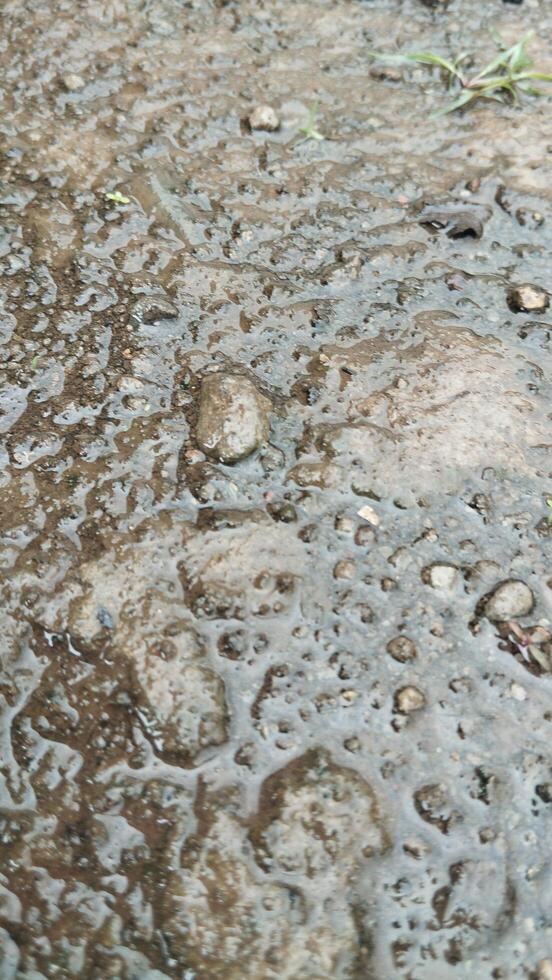 Photo of a cement and stone surface after rain with water pooling. Diffuse natural light. Suitable for AI datasets of road surface conditions. Free Photo