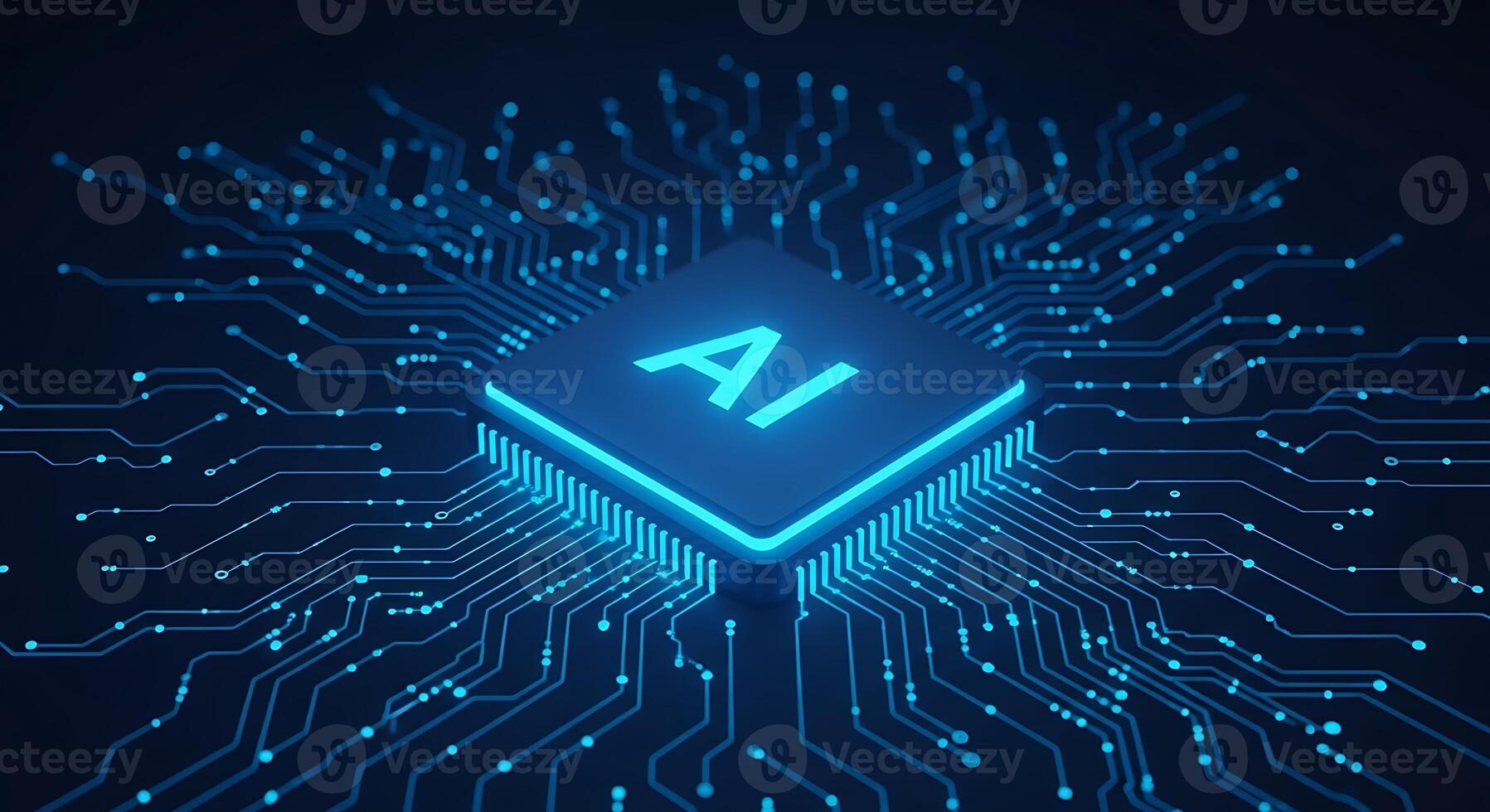Abstract digital illustration of a glowing blue ai chip with intricate circuitry, symbolizing artificial intelligence and technology Pro Photo