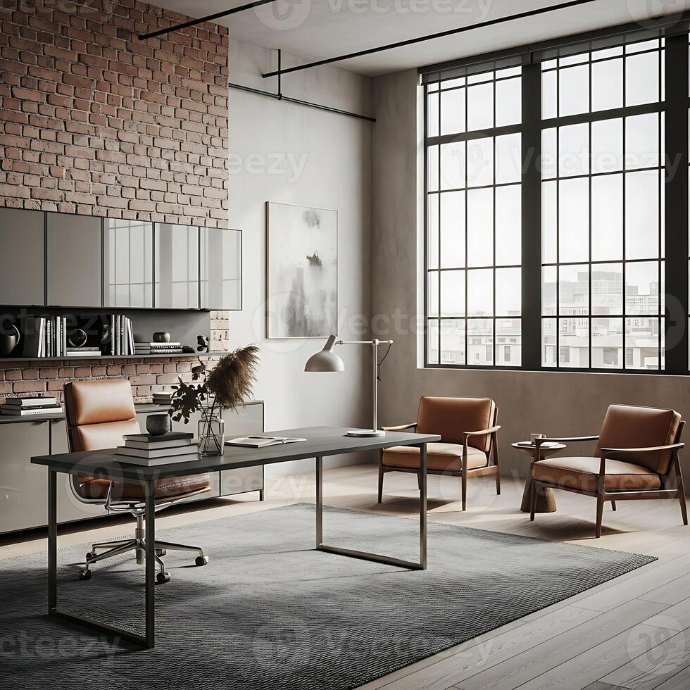 Modern office interior with a large window, comfortable seating, and a desk, creating a stylish and productive workspace Pro Photo