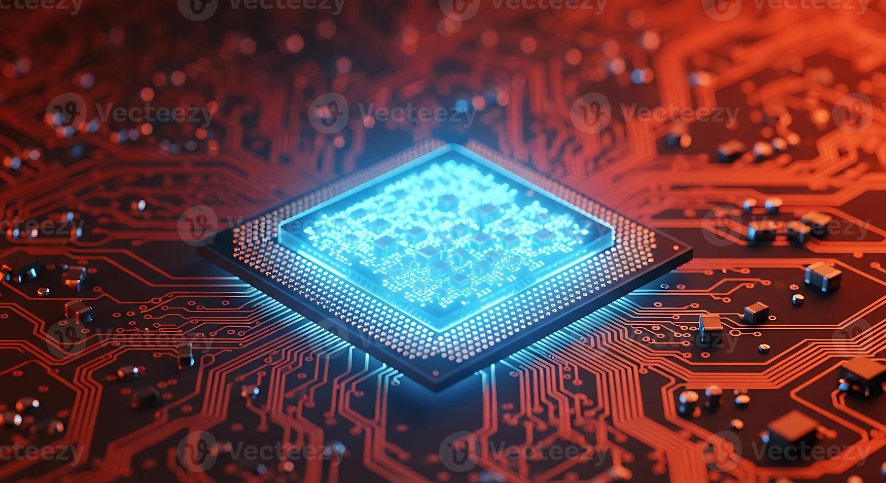 Closeup of a glowing blue computer processor chip on a red circuit board with intricate pathways Pro Photo